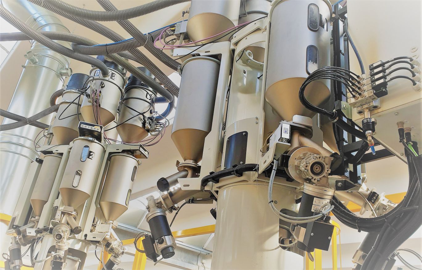 The production process starts mixing polymers, colouring agents and other additives in the quantity required for the compound production.